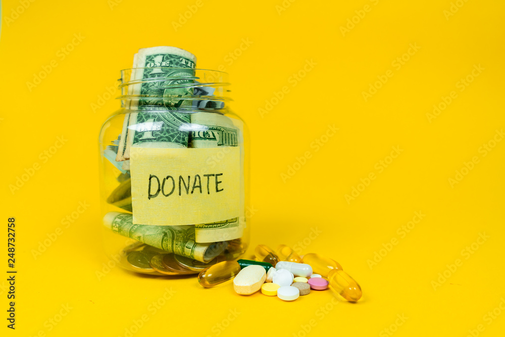 Money jar with dollars and coins for donation. Medicine donation concept. Isolated on yellow background