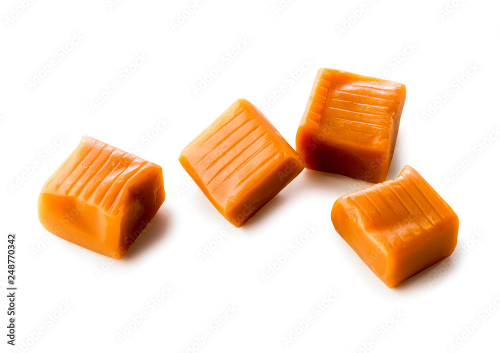 four toffee caramel candies close-up isolated on white background (with clipping path)