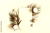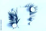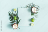 Summer composition. Tropical palm leaves, fruits, paper blank on pastel blue background. Summer concept. Flat lay, top view, copy space