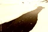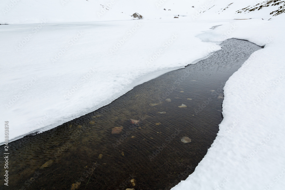 Corriente de agua, hielo y nieve. Laguna de origen glaciar Las Verdes, Torre de Babia, León, España.