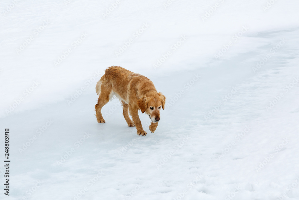 Perro caminando sobre hielo en la laguna de origen glaciar Las Verdes, Torre de Babia, León, España.