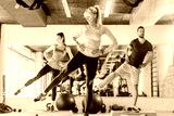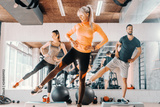 Group of friends doing fitness exercises for legs in gym. In background their mirror reflection.