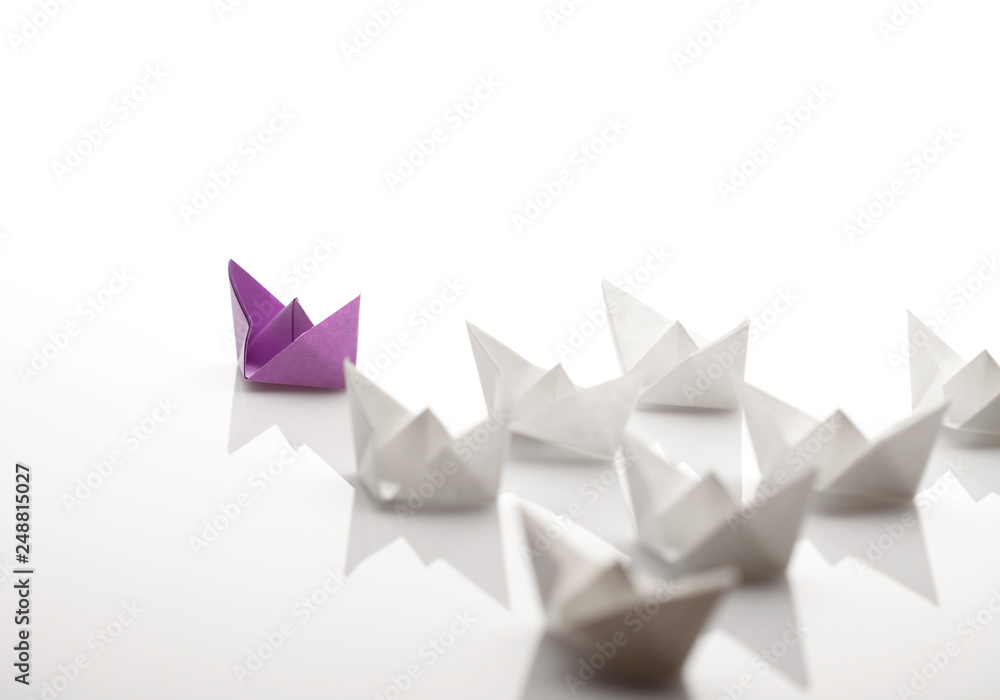 Leadership concept using blue paper ship among white