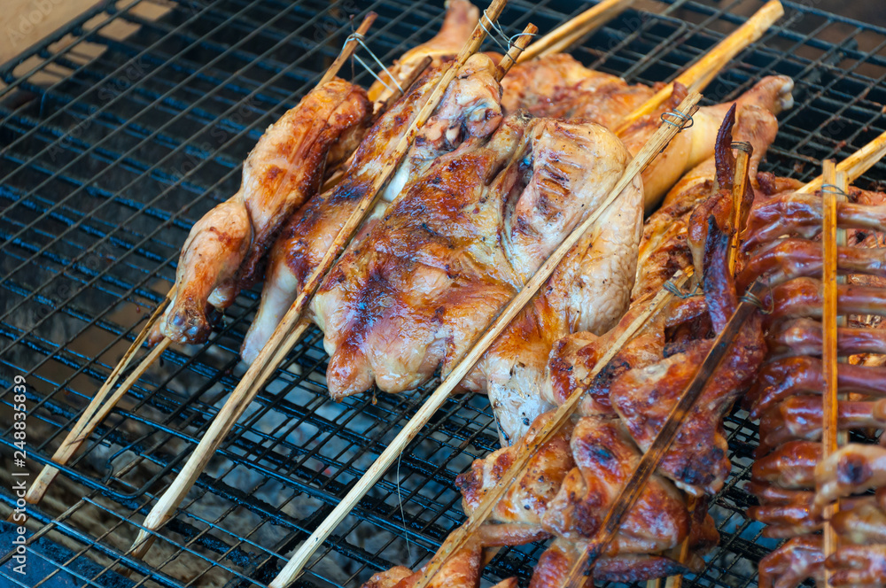 Close up chicken grill on stove in market traditional Thai food, Kai-Yang