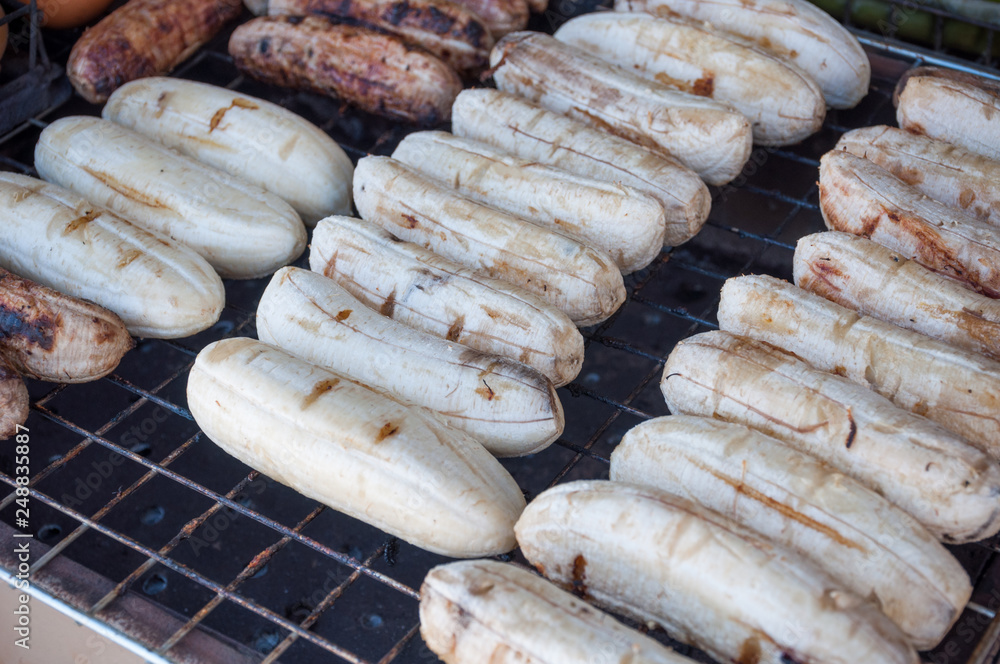 Close up banana grill on stove charcoal background