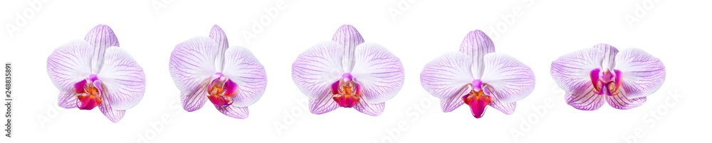 Collection White pink Moth orchid multi front view bloom isolated on white background, Phalaenopsis