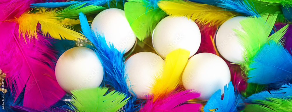 Creative layout made of white chicken eggs in wooden box with colorful feathers trendy neon colors. Spring and Easter holiday party concept with copy space. Flat lay, top view, close up.