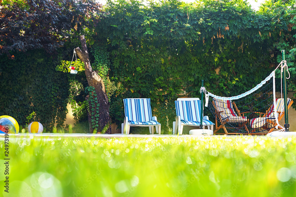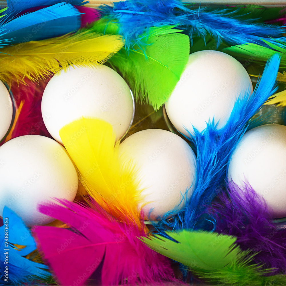 Creative layout made of white chicken eggs in wooden box with colorful feathers trendy neon colors. Spring and Easter holiday party concept with copy space. Flat lay, top view, close up.