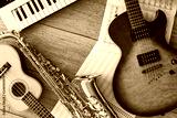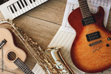 Composition of different musical instruments: synthesizer, electronic guitar, saxophone and ukulele lying, sheets with music notes lying on and wooden floor