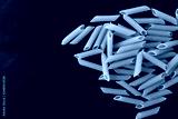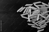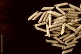 farfalle Raw penne italian pasta on a wood black textured background. Close-up view from the top. Free space for text.