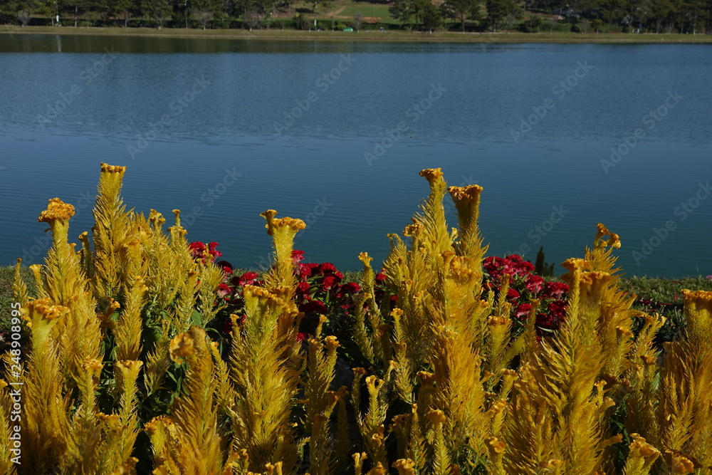yellow flower blossom by the lake