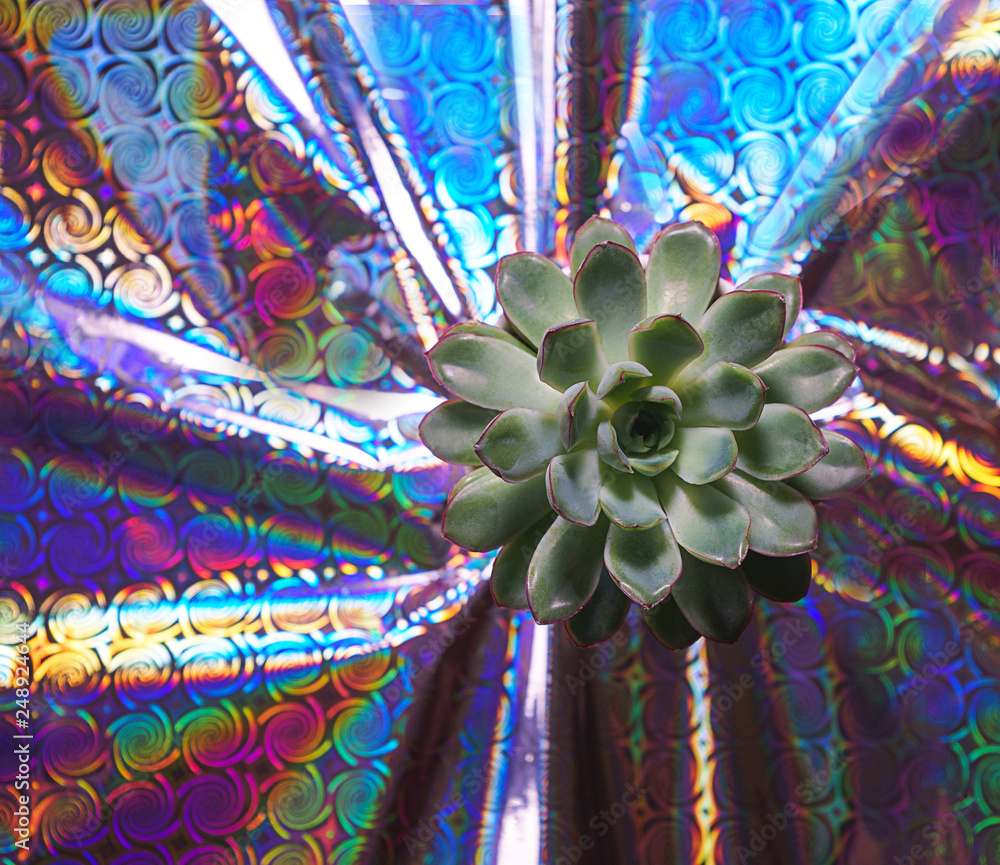 Beautiful green Succulent on Holographic Abstract Foil Backdrop. Trendy creative hologram gradient rainbow. Flat lay, top view, selective focus. Concept of gift, party for Valentine's day, birthday.