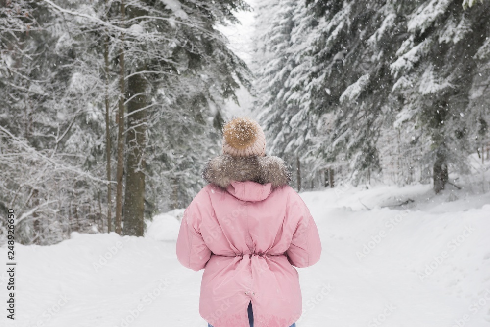 girl in winter jacket with hat from behind.girl in snowy mountain woods