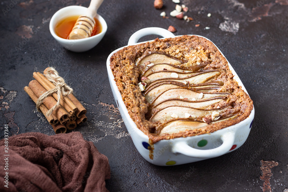 Diet crumble with oatmeal, cinnamon and pears decorated with hazelnut and honey in a frying pan for baking. Dark brown stone concrete. Top view, copy space.