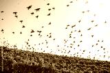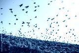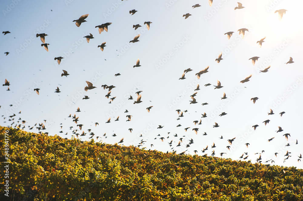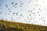 Flock of birds flying over Lavaux vineyards, Switzerland