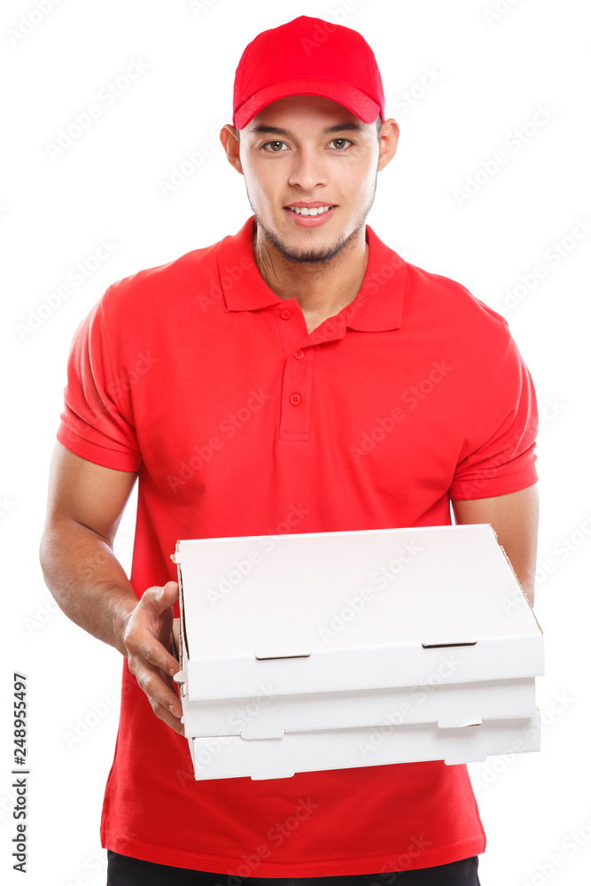 Pizzabote liefern Pizza Bote bestellen Bestellung Lieferung Beruf Mann Latino Freisteller freigestellt isoliert