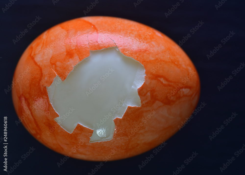 oranges osterei mit aufgebrochener schale vor dunklem hintergrund