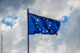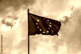 Problem in Europe. Dark and stormy clouds gather over European Union Flag