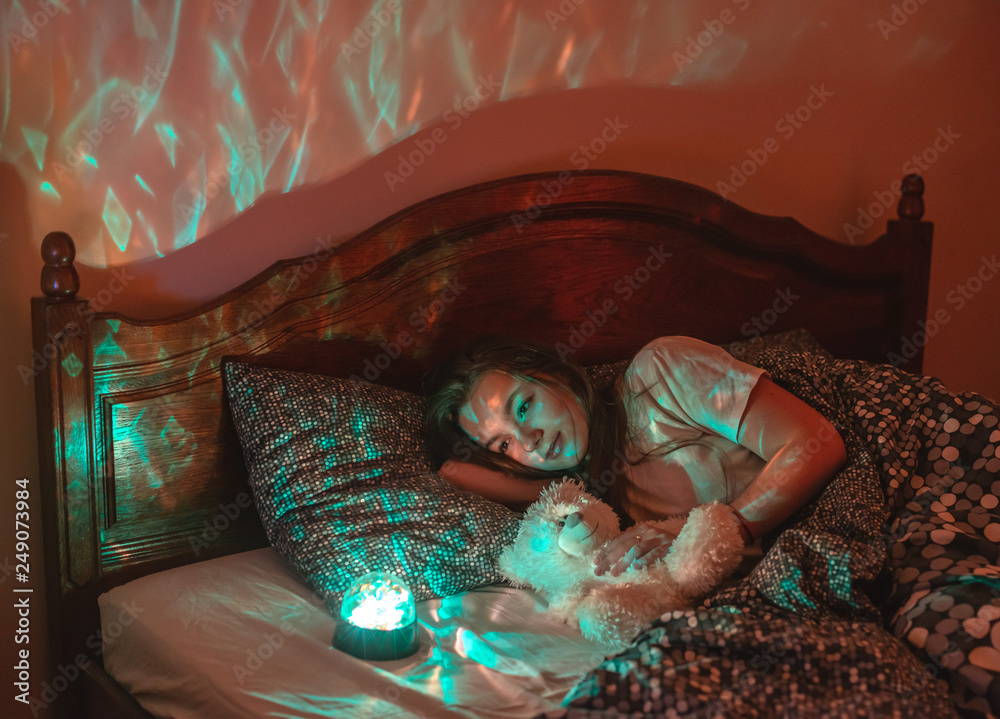 girl sleeps at night and sees quiet dreams. The teenager sleeps with a night radiant lamp in an embrace with a bear.