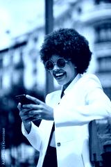 Beautiful girl for afro with mobile phone in the streets of Madrid Spain.