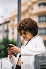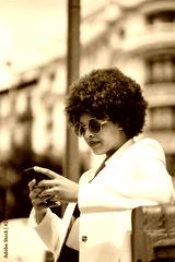 Beautiful girl for afro with mobile phone in the streets of Madrid Spain.