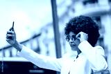 Beautiful girl for afro with mobile phone in the streets of Madrid Spain.
