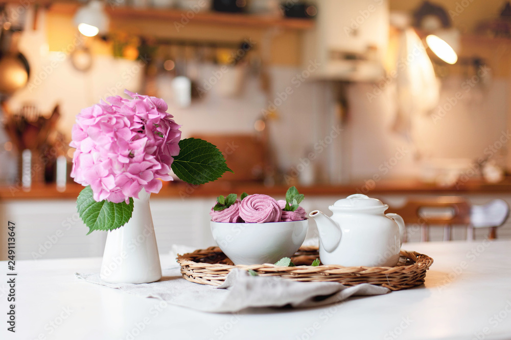 Morning breakfast on kitchen table. White teapot, pink cupcakes and hydrangea flowers are serving on straw tray. Tea time, cozy home atmosphere hygge. Summer still life with sweets.