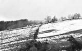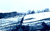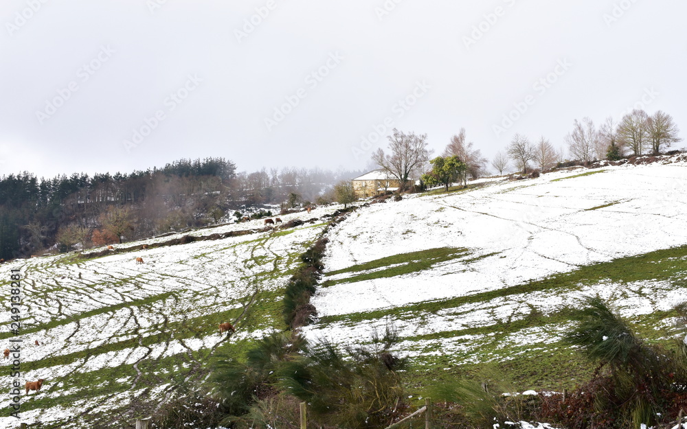 Winter landscape with house on a snowy slope, cows, trees and fog. Lugo, Galicia, Spain.
