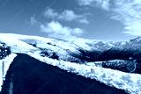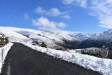 Winter landscape with road and snowy mountains. Blue sky with clouds. Ancares Region, Lugo Province, Galicia, Spain.