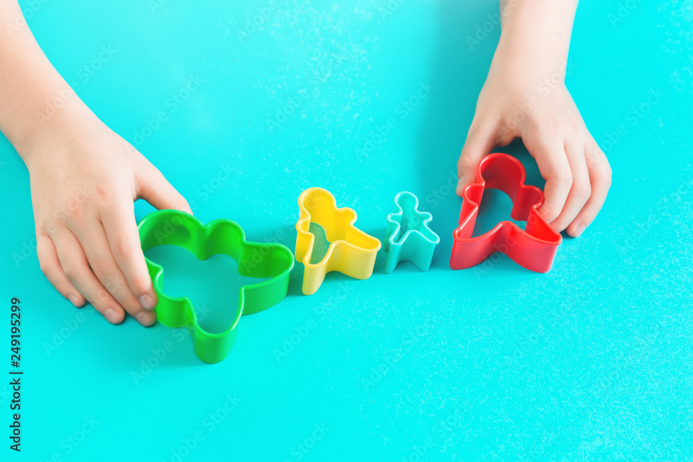 Happy family concept cut outs in hands of a child. Mother, father, son, daughter top view with copy space