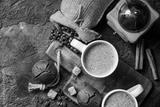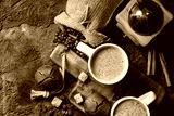 Black fried coffee beans in cafe with cookie and cake on dark textured background