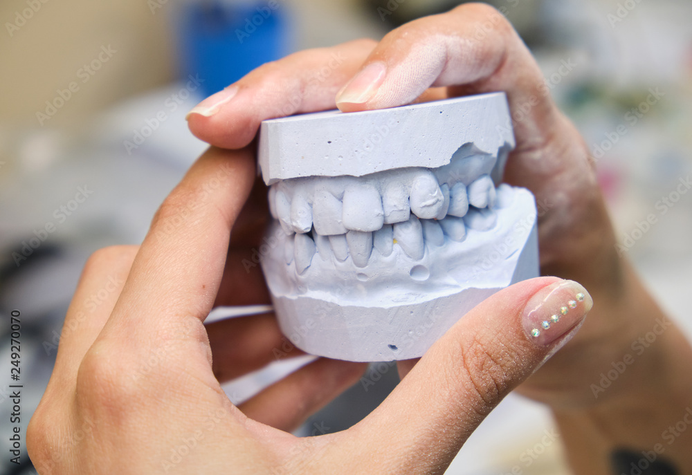 Dentist holds in her hands a jaw of denture printed in 3D. The patient looks at the shape of future veneers at the dental clinic