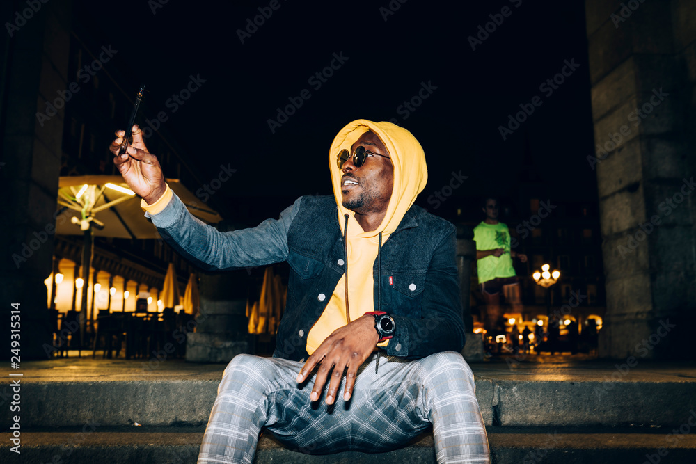 Handsome funny African man with mobile phone at night.