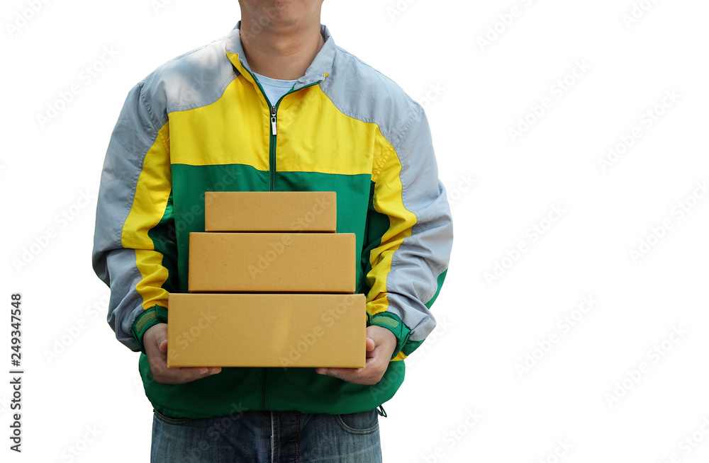 Delivery man staff in the colorful jacket uniform holds parcel box that is about to be delivered to customer isolated on a white background, with copy space