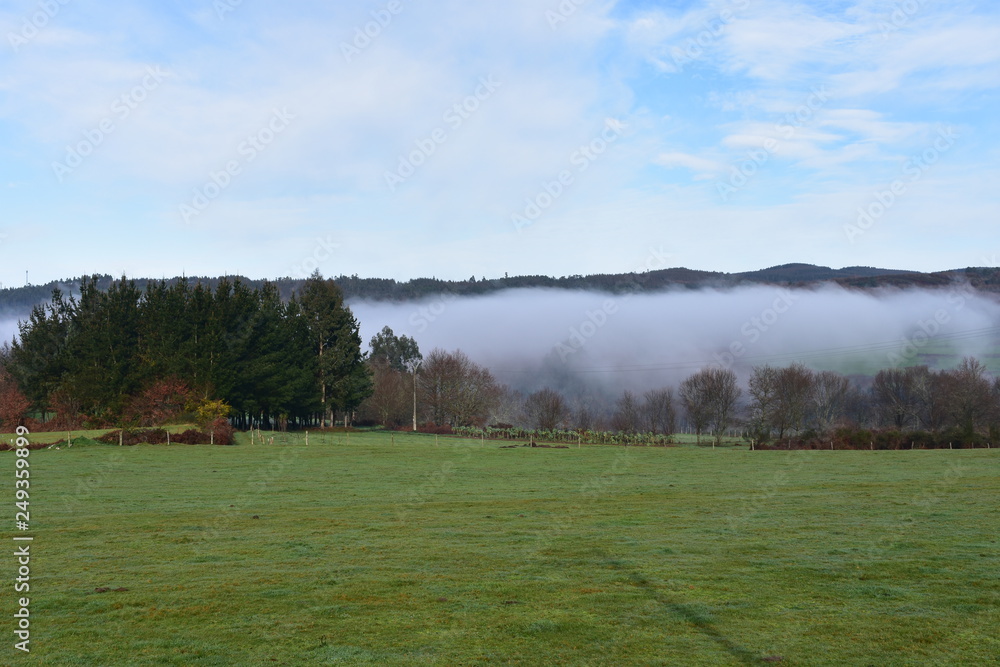 Morning landscape with fog, green field and pine trees. Galicia, Spain.