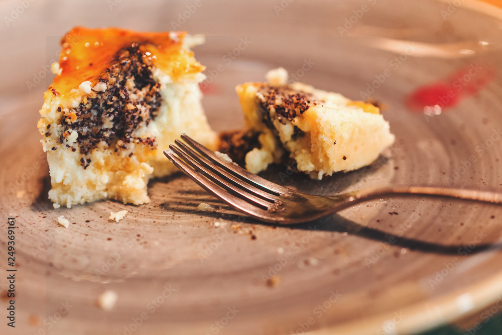 Half eaten delicious piece of cottage cheese and poppy cake on plate with a fork and crumbles in a cafe with copy space