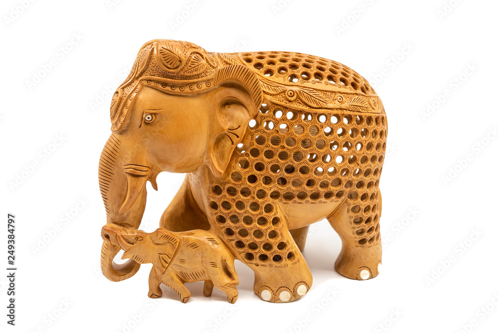 Traditional carved elephant mother and baby statue souvenir, isolated on a white background