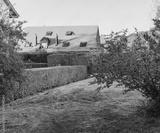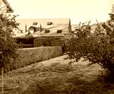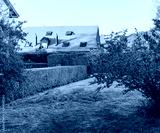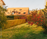 Warm evening image of small cozy backyard in sunset light with blossoming Chaenomeles or Japanese quince