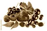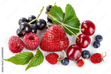 Set fresh berry. Mix summery fruit raspberry strawberry currant blueberry and wild strawberry with green leaf still life, isolated on white background.
