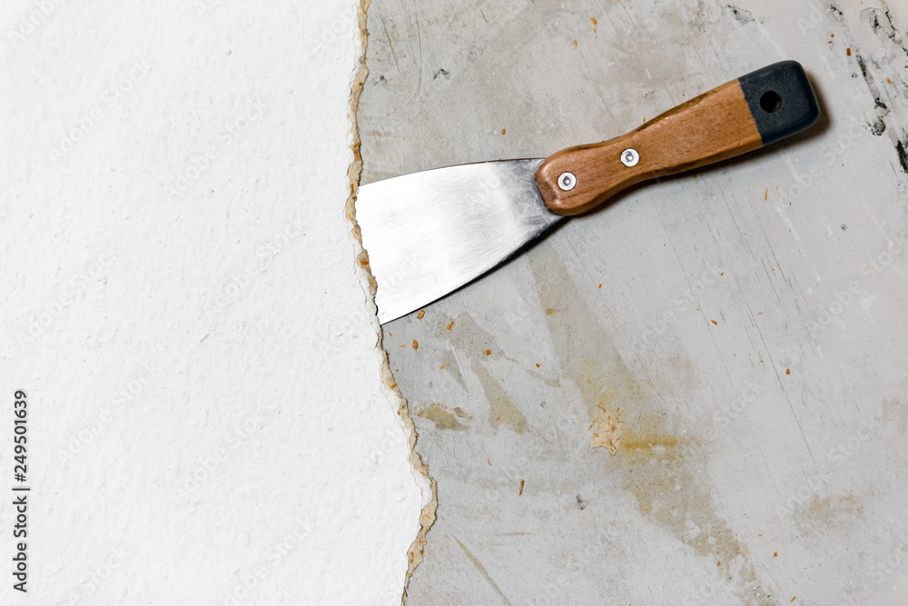 Abgerissene Tapete mit darunter liegender rohen Wand und Spachtel derdahinter klemmt, alter Putz oder Gips, Löcher und Risse werden zugespachtelt