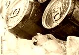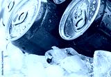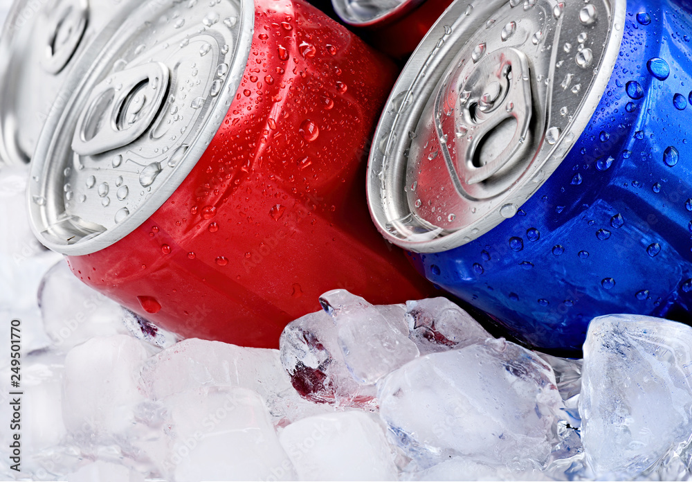 Red and blue cans with droplets on ice cube