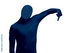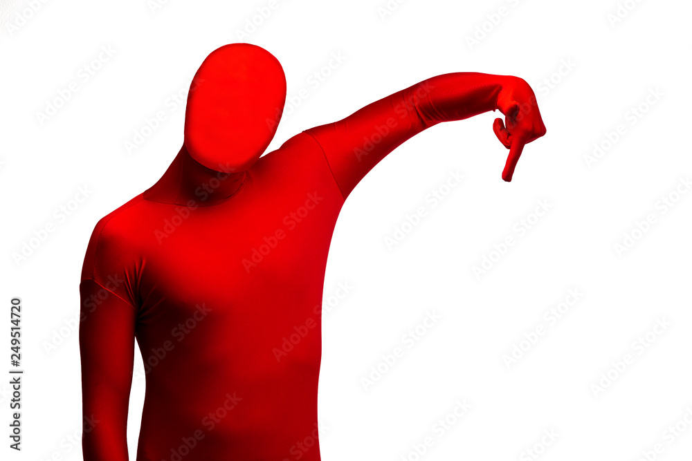 Red man pointing finger down. Specifies the direction. Isolated on white.