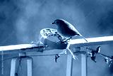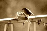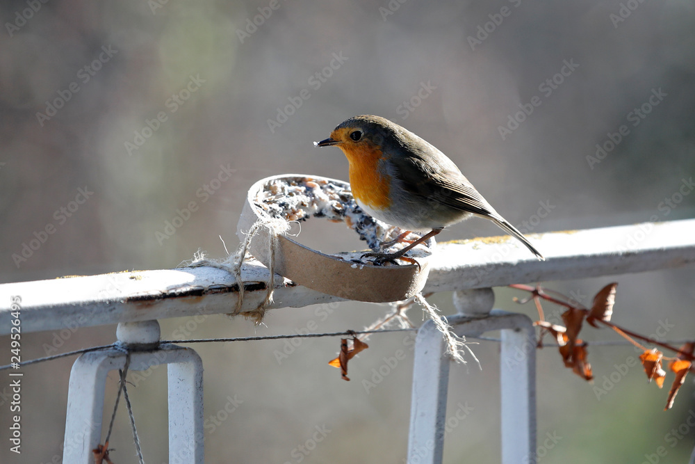Ein Rotkehlchen frisst im Winter Futter an einem Futtering aus Samen, Kernen, Haferflocken und Fett auf einem Balkon