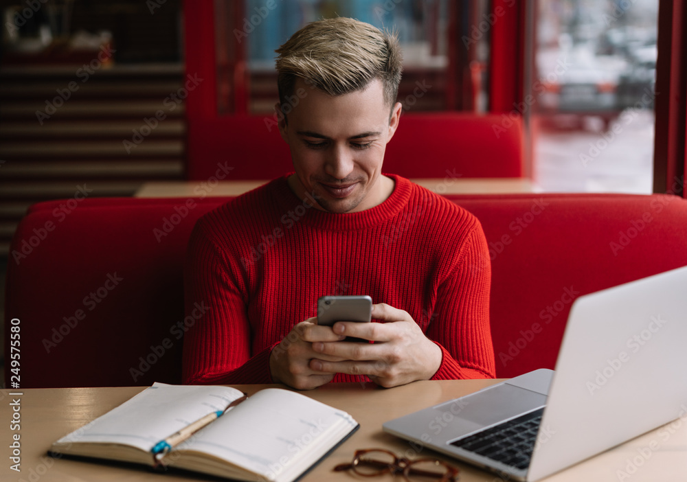 Portrait of handsome man in red sweater using mobile phone, booking travel online in modern cafe. Stylish guy with happy emotional face downloading application for online shopping. Mobile banking.