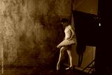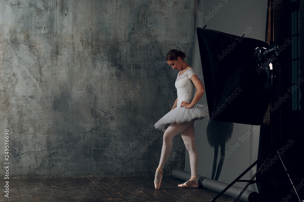 Ballerina female. Young beautiful woman ballet dancer, dressed in professional outfit, pointe shoes and white tutu.