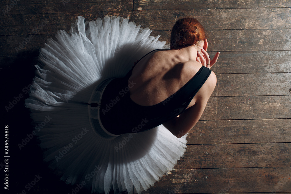 Ballerina female. Young beautiful woman ballet dancer, dressed in professional outfit, pointe shoes and white tutu.