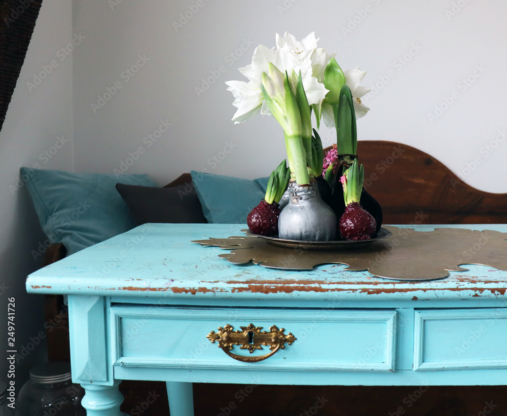 Interior decoration - Waiting for Spring. Amaryllis and Hyasinth bulbs dipped in vax. Cute flowers on the turquoise vintage table.