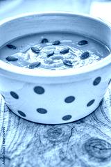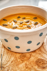 Bowl of pumpkin cream decorated with its own seeds