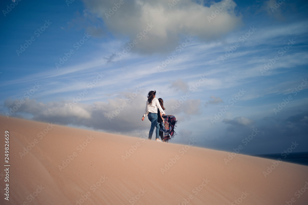 Two pretty women have fun in the dunes of Bologna, Andalucia Spain.