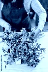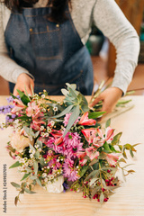 Woman florist makes flowers bouquet and wrapping in pack paper